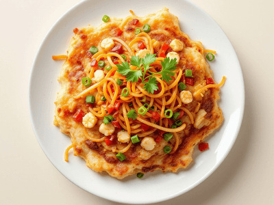 Okonomiyaki (Osaka-style) is a savory Japanese pancake beloved throughout Japan for its versatility and rich umami flavor. Originating from the Kansai region, especially Osaka, this dish combines shredded cabbage, flour, eggs, and dashi, topped with a variety of ingredients such as sliced pork, green onions, and bonito flakes. The name ‘okonomiyaki’ literally translates to ‘grilled as you like it,’ reflecting its customizable nature and popularity at Japanese street food stalls (yatai) and home gatherings. The taste of Osaka-style okonomiyaki is a harmonious blend of tender cabbage, succulent pork, and the depth of dashi, all enhanced by tangy okonomiyaki sauce (similar to tonkatsu sauce), creamy Japanese mayonnaise, and aromatic aonori (seaweed flakes). Its crisp exterior and fluffy interior make it a delightful dinner option, perfect for sharing and celebrating Japan’s culinary culture. This healthy, home-cooked version uses seasonal vegetables and lean protein, making it lighter while retaining authentic flavors. Okonomiyaki is not only delicious but also a festive dish, often enjoyed during local festivals and family occasions, embodying the spirit of Japanese hospitality and creativity.