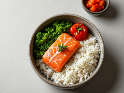 This dish is a healthy choice because it combines lean protein, whole grains, and nutrient-dense vegetables, all arranged in portion-controlled servings. The use of grilled salmon instead of fried, minimal oil, and steamed rice ensures lower fat content. Seasonality and freshness of ingredients maximize nutrition and flavor, supporting balanced eating and weight management.